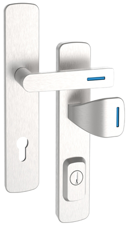 Sicherheitsbeschlag Rostex RX1 Astra RC3, Edelstahl matt, Luminoblau, Bologna-Griff – Vierkantgriff