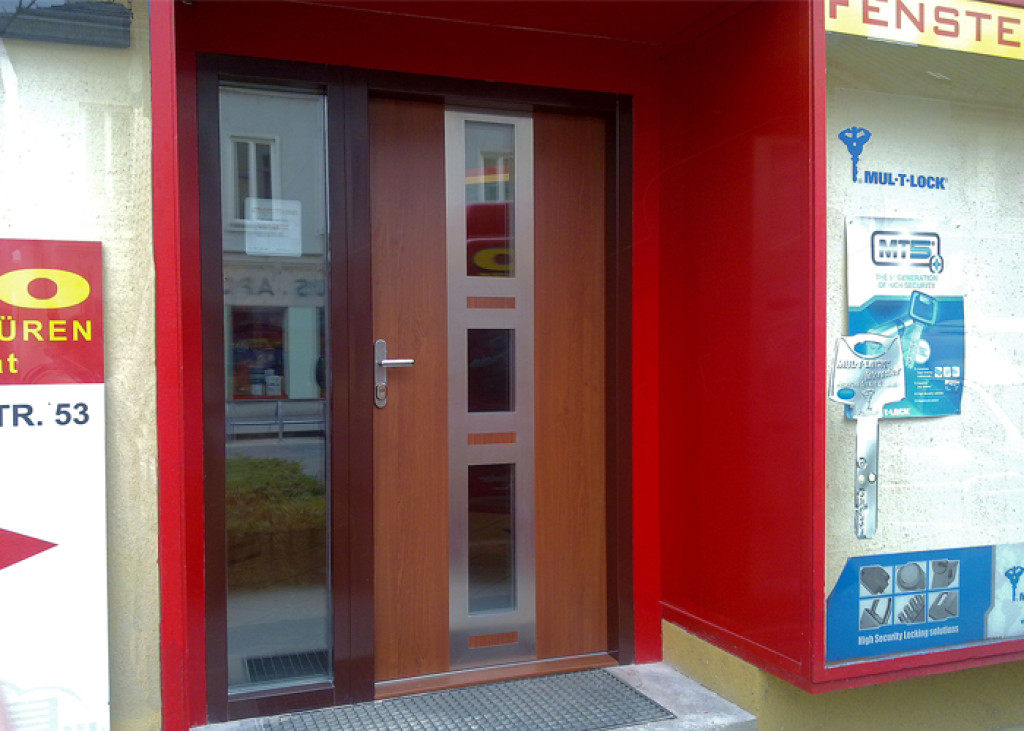 ADLO - Thermo-Sicherheitstür LISBEO, verglast mit Fixteil, Edelstahlleisten, ADLO Türzarge mit Holzdekor