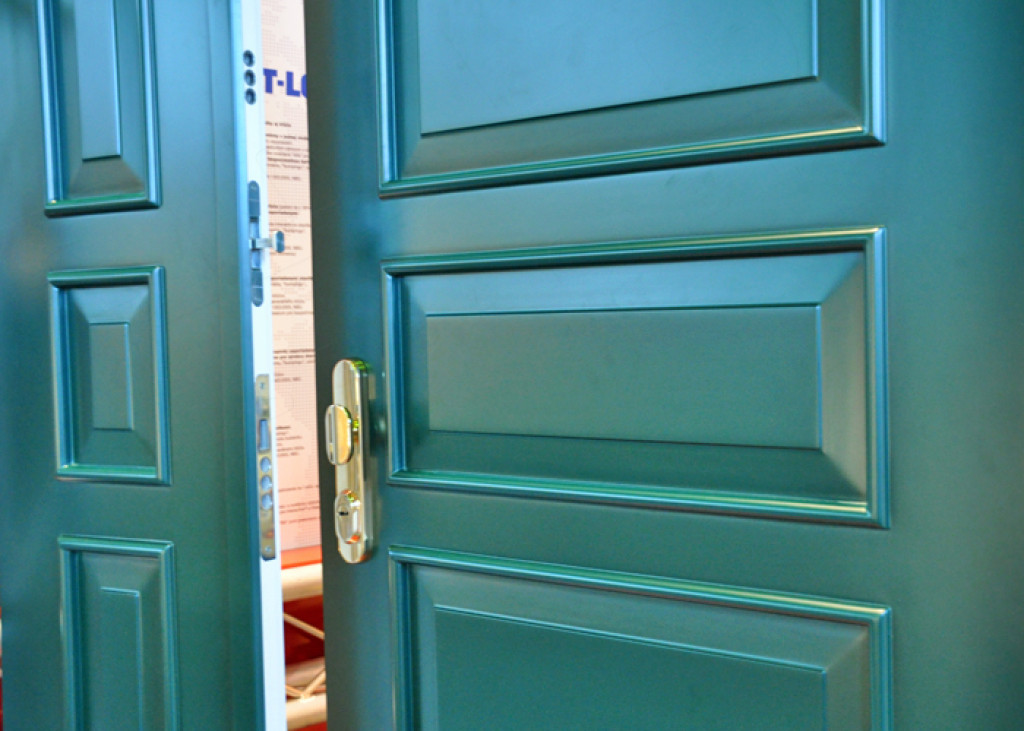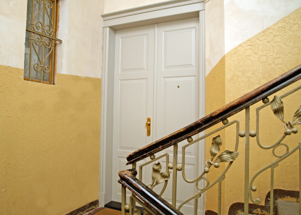 ADLO - Sicherheitstür ADUO, atypisches Kasettendesign, Oberfläche RAL 6019, atypische Verkleidung der Türzarge